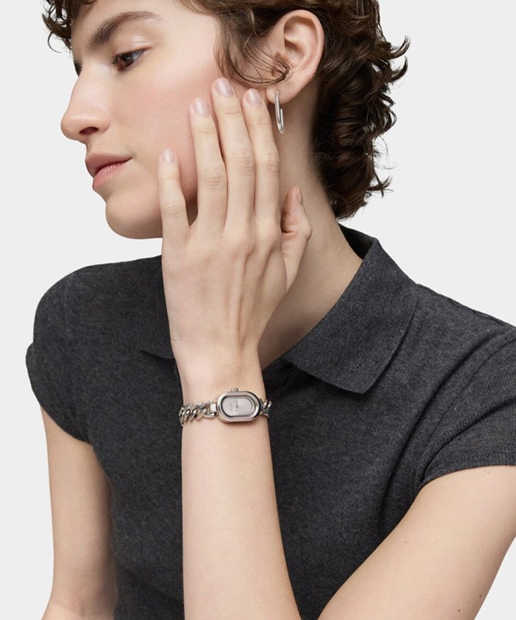 Relógio analógico elegante com mostrador oval e bracelete de barbela em aço prateado com fecho de joia. Caixa de 18 x 28,5 mm com vidro mineral. Movimento de quartzo e resistência à água até 5 ATM. Ideal para um estilo sofisticado e intemporal.